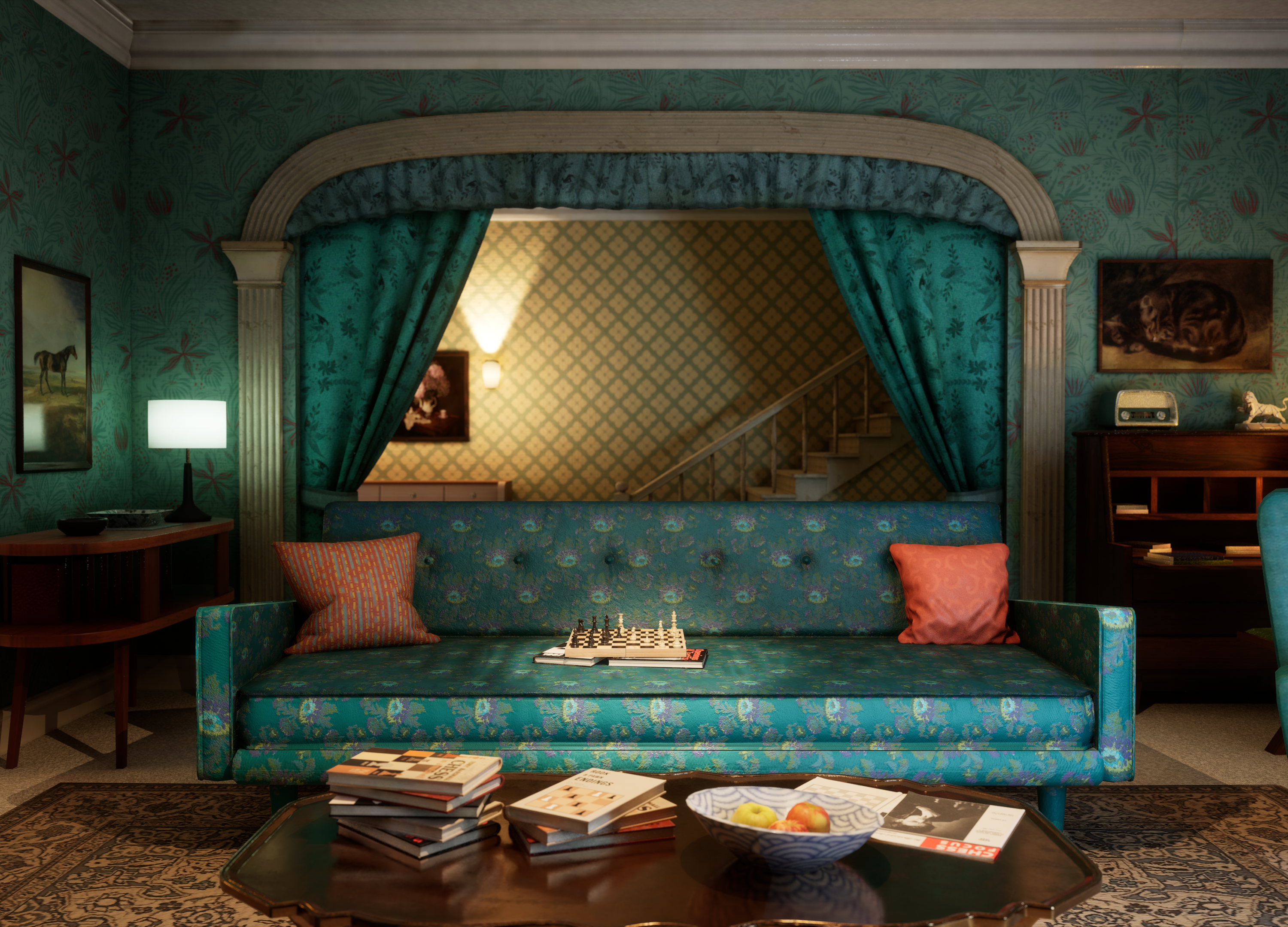 “Our aim was to try and achieve what the show did and ensure that players were immersed in The Queen’s Gambit world at every turn. Everything in this room, from the TV trolley to that incredible piano, was carefully modelled to create that immersive experience.” – Jake Parrott, 3D Artist