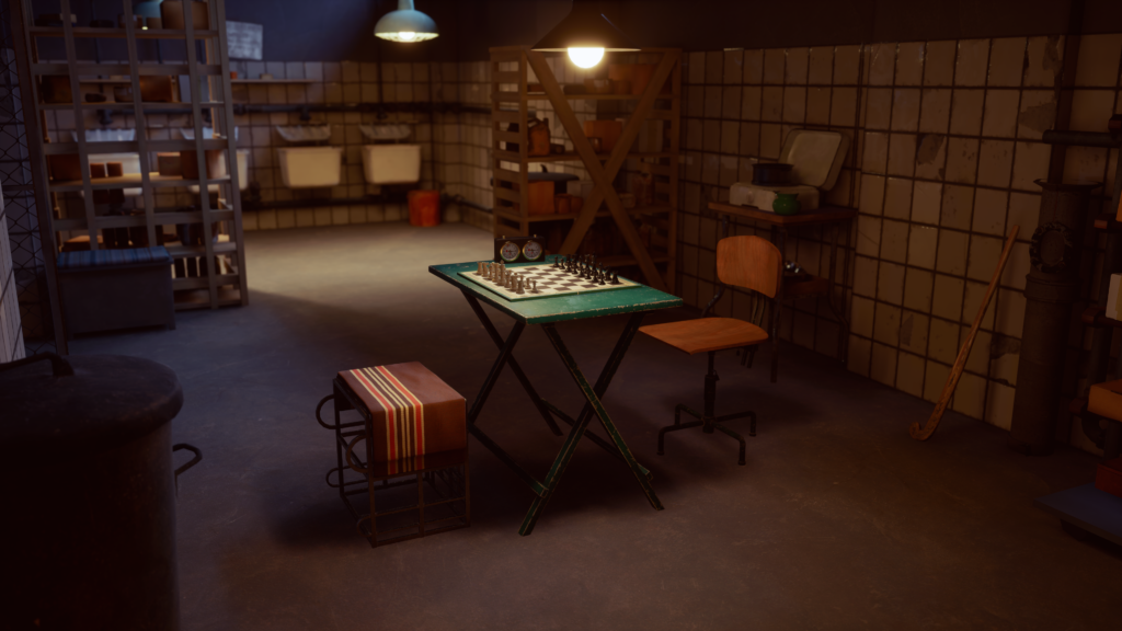 “Our team recreated Mr Shaibel’s Basement with great attention to detail. We knew wanted to capture that lived-in feel, so almost all aspects of the space have been textured with minute details. Things such as the cracked tiles, the weathered chessboard, and the grubby janitorial sinks are intended to work together to create the impression that this is a real space.